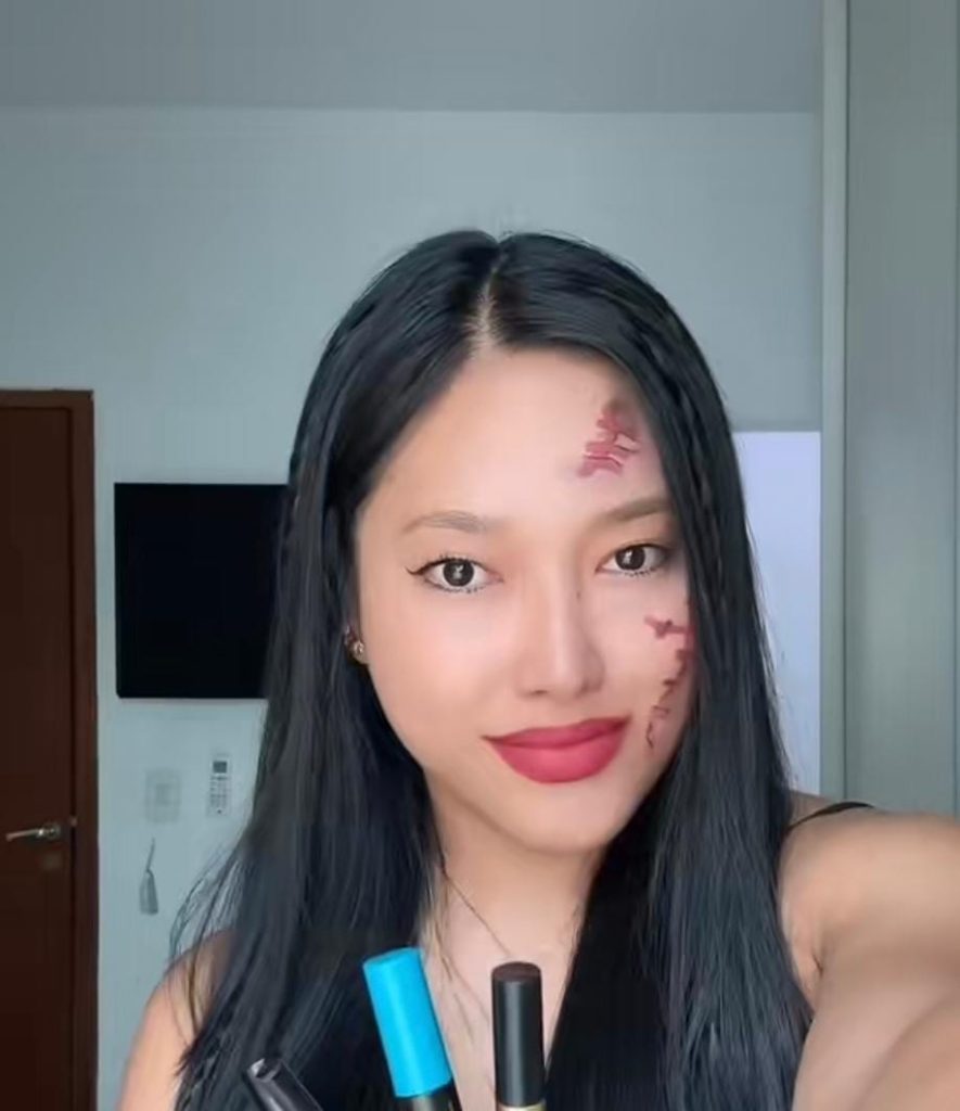 Já a influencer Bia Prado se desafiou a realizar um visual de Halloween com a utilização de apenas um produto da Avon – o batom vermelho sangue de nome “a mão que não retoca o beijo”.