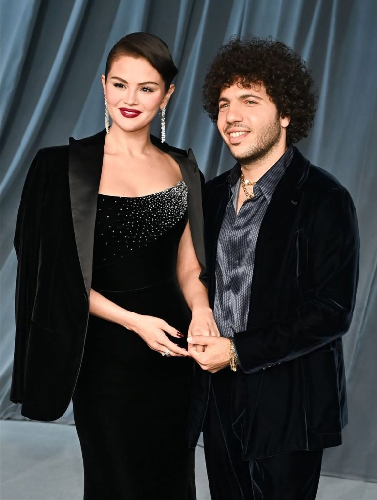 O casal Selena Gomez e Benny Blanco também ficaram sob os holofotes da festa. A cantora optou por um vestido sem alças de veludo preto da Giorgio Armani Privé com cristais, uma jaqueta de veludo preta para complementar o look e joias de diamante. Blanco, por sua vez, usou um terno de veludo azul‑meia‑noite, também da Armani.